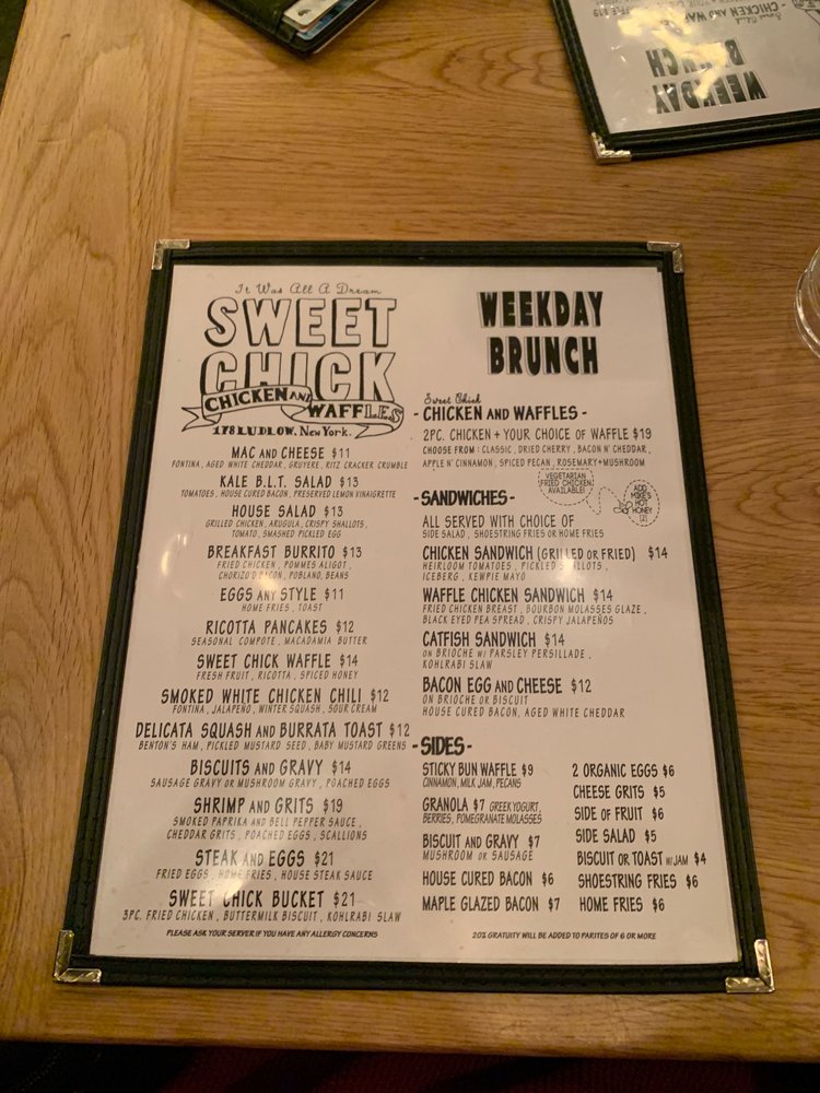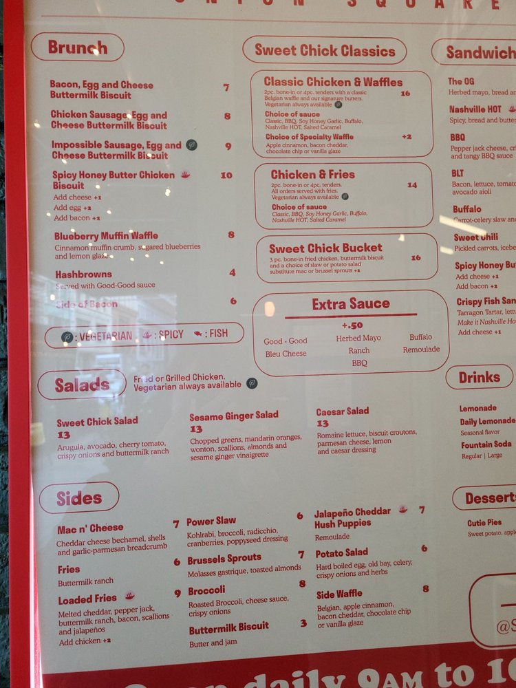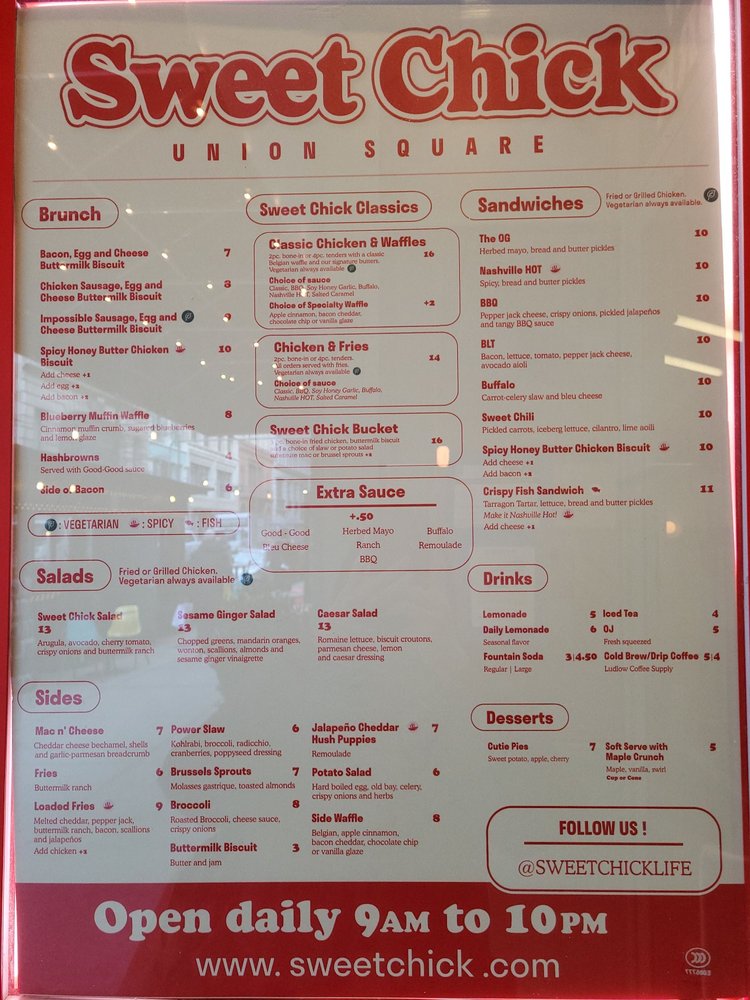 Sweet Chick located at 178 Ludlow St in New York, offers a trendy dining experience with a focus on breakfast and brunch. The menu includes mouthwatering options like the Meyhem Worldwide Fried Chicken Sandwich with provolone cheese and fig jam, as well as the Classic Chicken & Waffles served with hot sauce and maple syrup. Customers have raved about the quality of the chicken dishes and the variety of flavors available. The atmosphere is described as hip and casual, with great vibes for a fun dining experience. While some customers have mentioned occasional issues with food temperature and service, overall, Sweet Chick seems to be a popular spot for satisfying comfort food cravings.